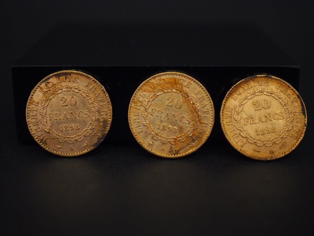Trois pièces de 20 francs or, 1898-A. FRAIS ACHETEURS 5% TTC.