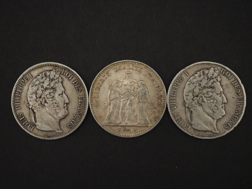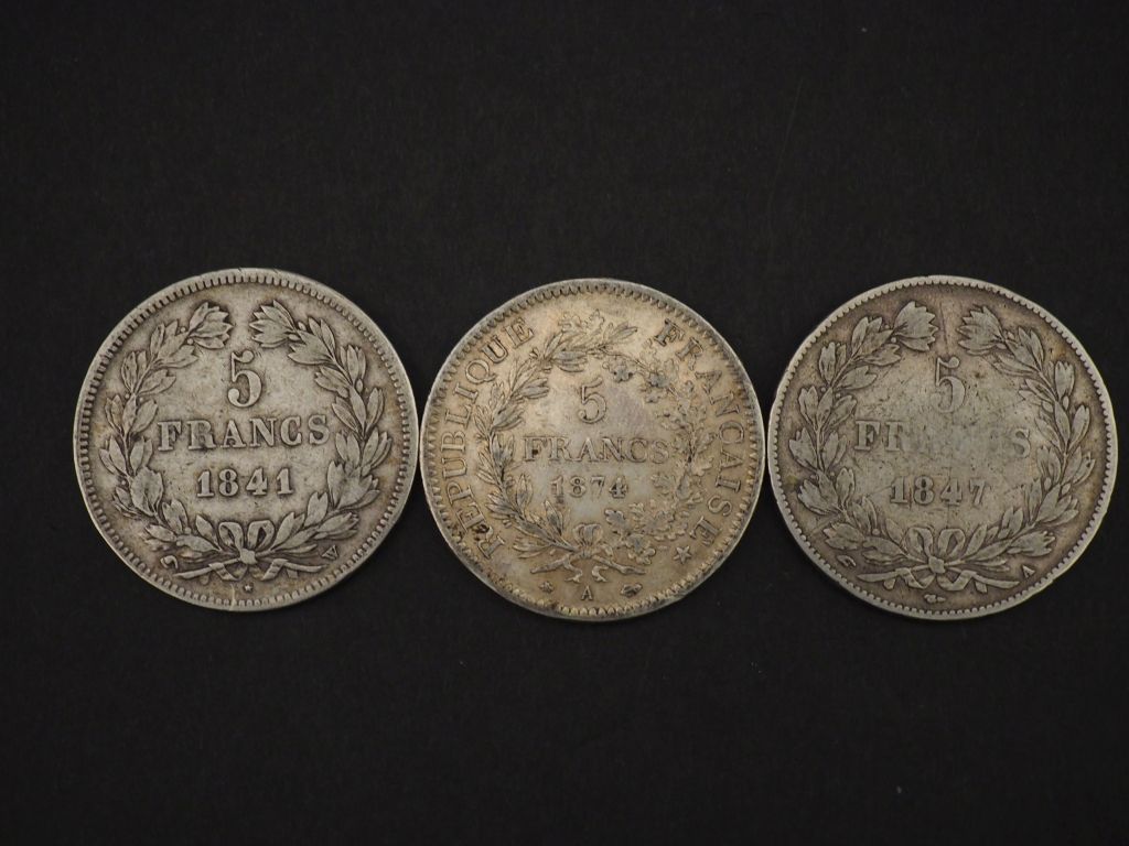 Trois pièces de 5 Francs en argent, 1841-W, 1847-A et 1874-A. Poids. 74,21 g