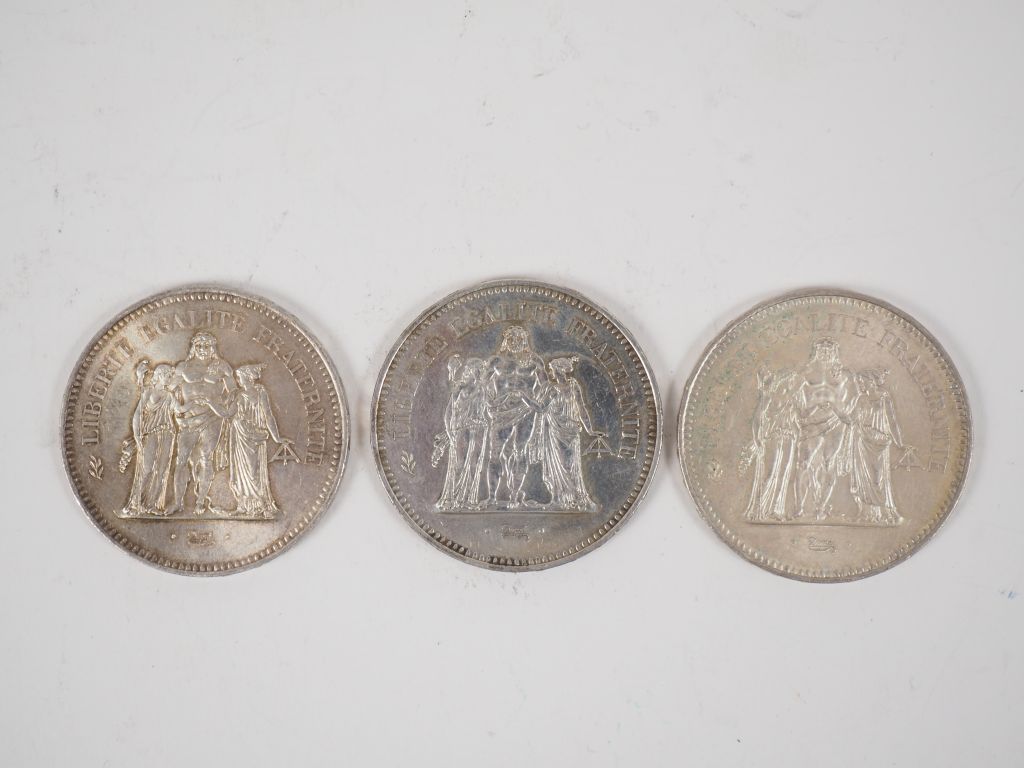 Trois pièces de 50 Francs en argent, 1977 (2) et 1979. Poids. 89,99 g