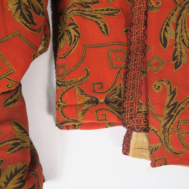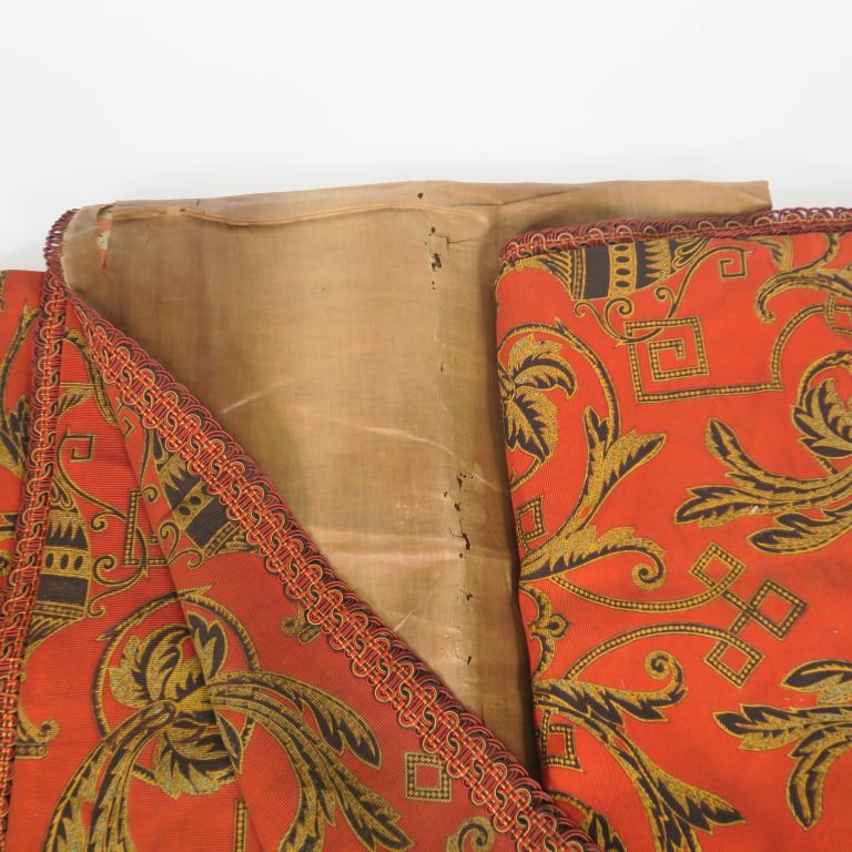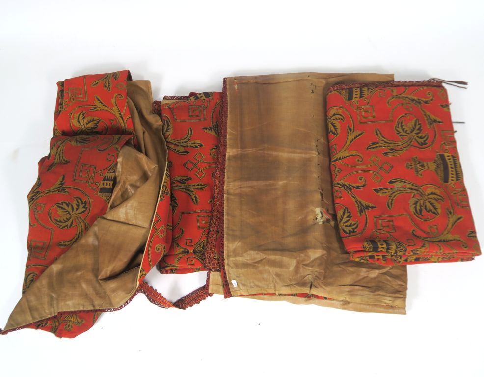 2 paires de rideaux anciens à décor de rinceaux noir et dorés sur fond rouge.