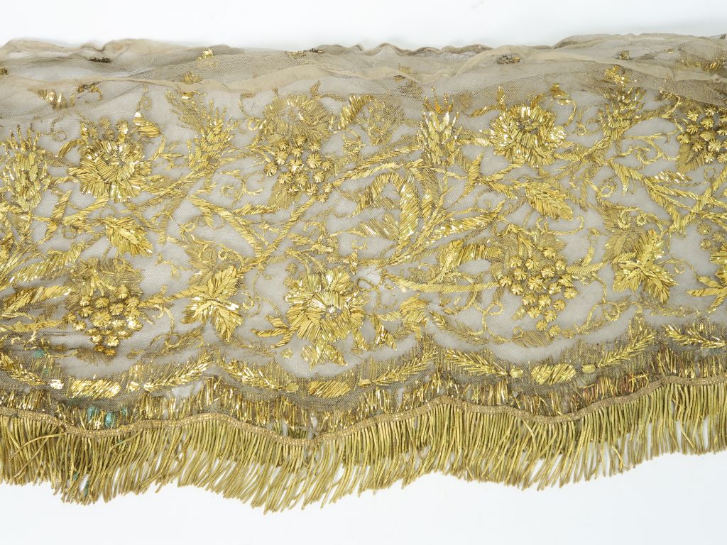 Antependium en tulle, belle broderie de lames dorées, à décor de pampres de vigne et de grappes de raisins, symbole de l’Eucharistie. H. 40 cm environ (tulle empoussiéré, quelques trous) Expert : Véronique Dumont Castagné
