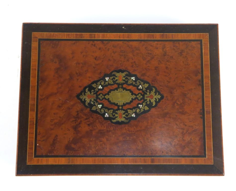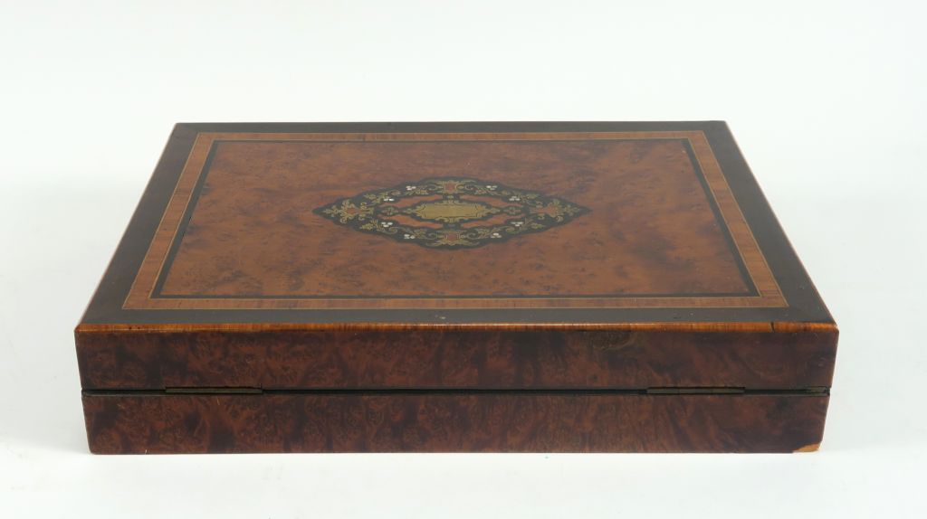 Boîte à jeux Napoléon III en marqueterie Boulle et son contenu de jetons en os polychrome. 6 x 31 x 23,5 cm