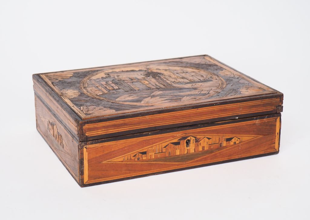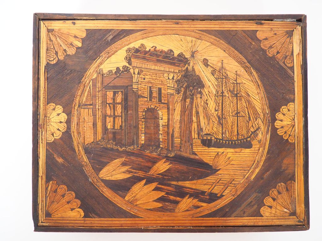 Boîte à ouvrage début XIXème en marqueterie de paille à décor de marine et d'habitations. Dim. 7,5 x 24,5 x 19,5 cm.