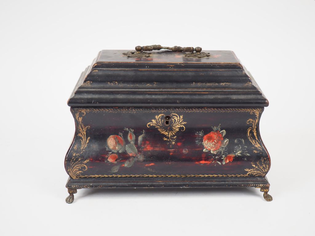 Boîte à thé Napoléon III de style Louis XIV à décor de fleurs polychromes sur fond noir. 17 x 25 x 15,3 cm
