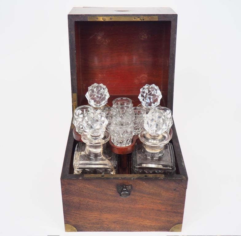 Cave à liqueur Restauration en acajou et cristal à décor de croisillons, comprenant quatre flacons et six verres. (un flacon accidenté, manque un écu à l'entrée de serrure, égrenures)