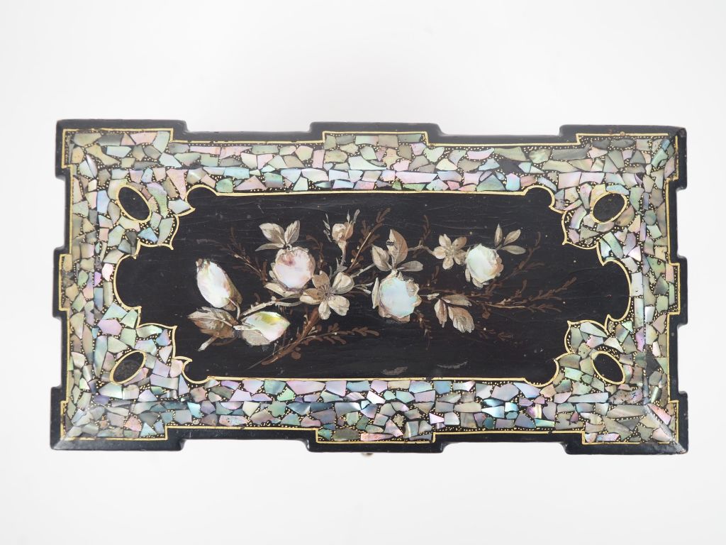 Cave à odeurs Napoléon III en marqueterie de burgot et bois noirci, intérieur à trois flacons en cristal et métal argenté. Avec sa clé Dim. 13 x 20,5 x 10,5 cm
