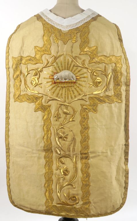 Chasuble fin XIXème - début Xxème. Fond drap d’or. Orfroi avant aux arabesques florales brodées en guipure filé or, décor identique sur l’orfroi du dos dans lequel s’inscrit dans la partie centrale un Agneau de Dieu aux pattes et tête argentées et au corps brodé en bouillon argenté, doublure bougran rose. Bel état. (tache à l’avant) Expert : Véronique Dumont Castagné