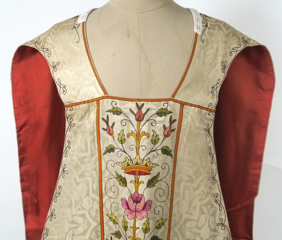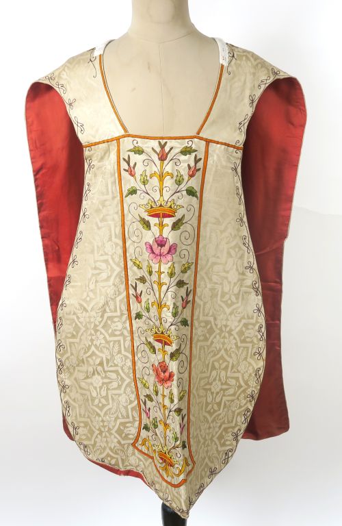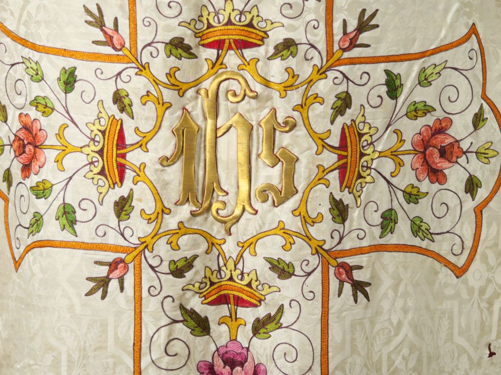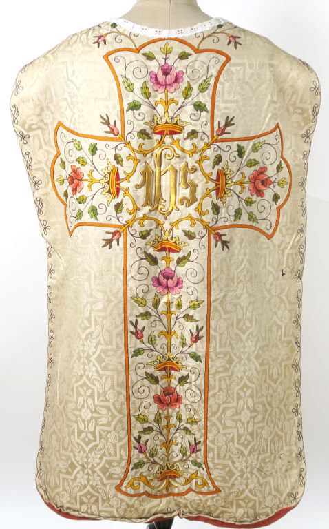 Chasuble fin XIXème - début Xxème. Fond satin damas crème, à décor néo-gothique. Orfroi avant, à décor de fleurs couronnées brodées, même décor pour l’orfroi du dos dans lequel s’inscrit le nom de Jésus "IHS" en guipure filé or . Doublure coton rouge. (trace d’usure au dos) Expert : Véronique Dumont Castagné