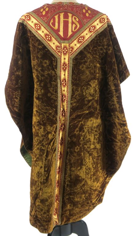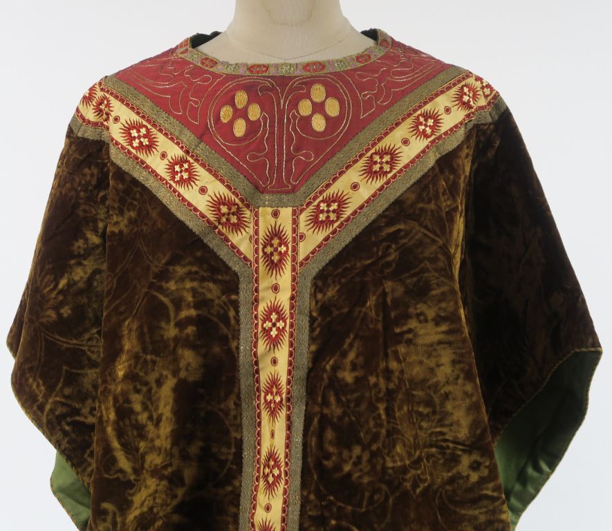 Chasuble semi-gothique et son étole XIXème - XXème , velours vert frappé, décor en ferronnerie et aux chardons dans le goût de la Renaissance, galons façonnés et broderies aux fils d’or à l’encolure. Bel état d’usage. Expert : Véronique Dumont Castagné