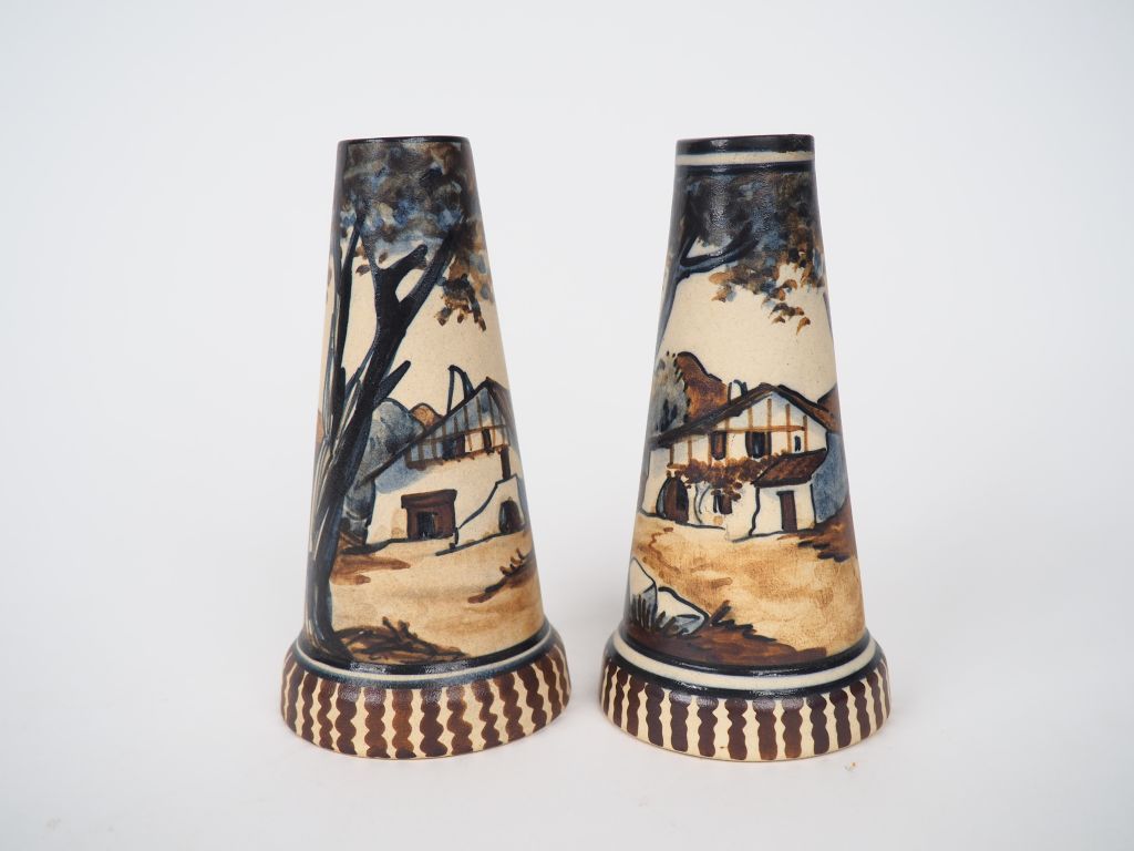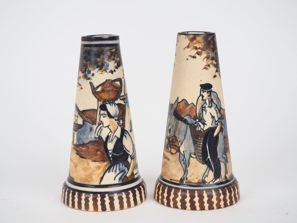 CIBOURE. Deux soliflores en céramique, à décor de paysans. Signés Berne et Hareau. H. 14,5 cm