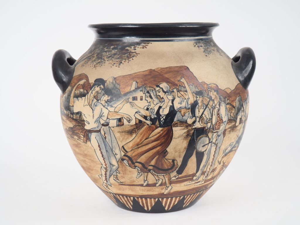 CIBOURE. Grand vase ovoide à anses en céramique, à décor de pelotari et de fandango. Signé Le Corrone H. 31 cm