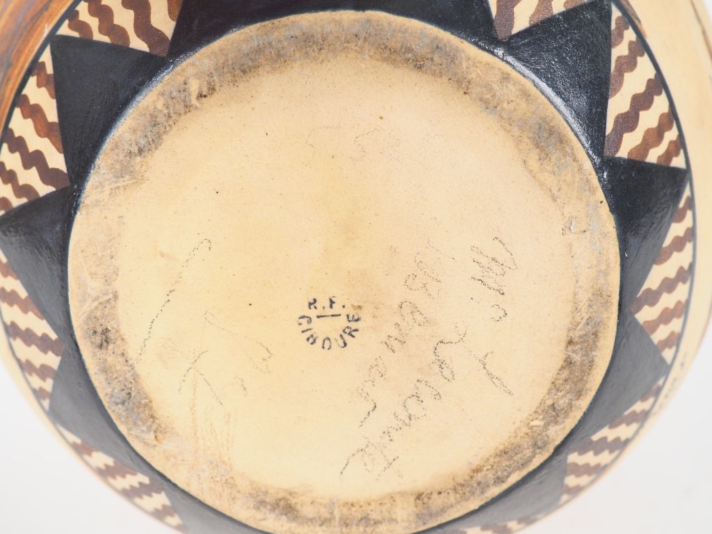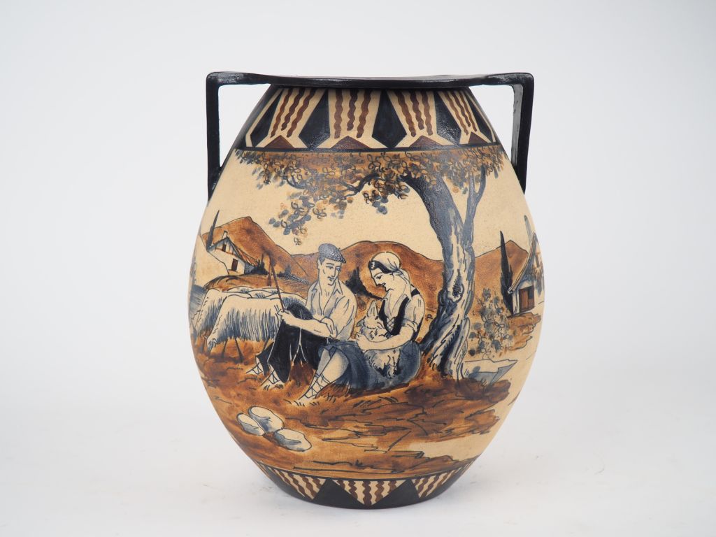 CIBOURE. Grand vase ovoide à anses signé Garcia de Diego, à décor de paysans basques devant leurs fermes. Marqué RF CIBOURE H. 27,5 cm