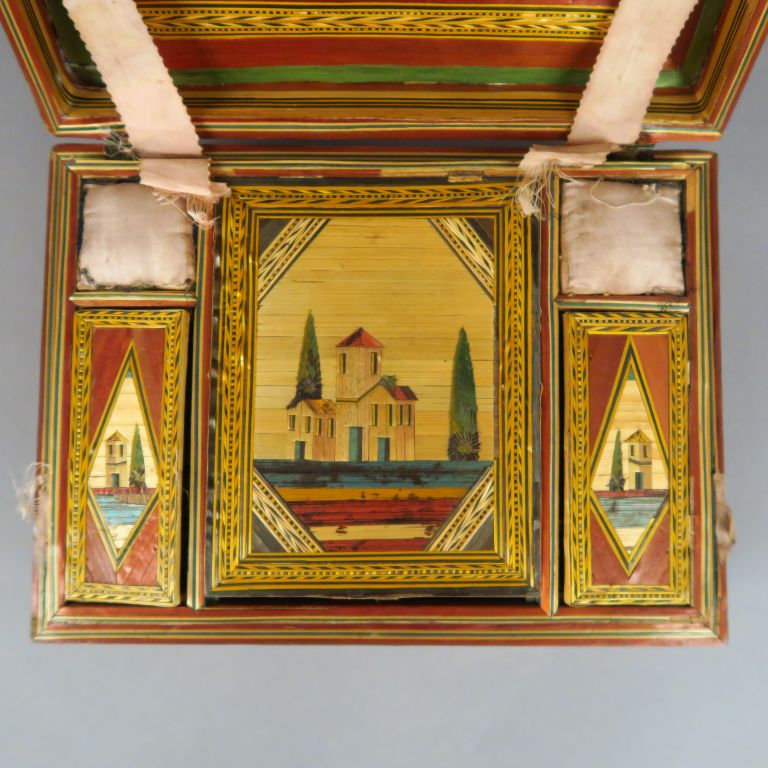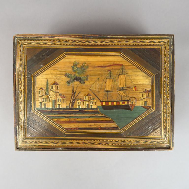 Coffret à couture Restauration en marqueterie de paille, à décor de paysage lacustre, de maisons et de frises de motifs géométriques. 8,5 x 22 x 16 cm (quelques petits manques et accidents)