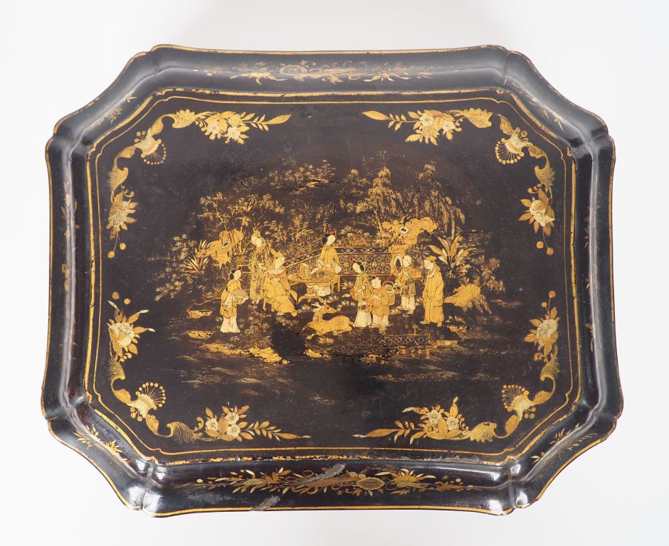Coffret à jeux Napoléon III de style Extrême-orient en bois laqué à décor de personnages dorés sur fond noir. Intérieur à compartiments avec ses jetons en nacre. Dim. 13 x 31 x 38 cm. (chocs).
