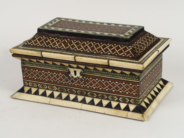 Coffret italien XVIIème en marqueterie à décor de motifs géométriques (restaurations) H. 17 cm L. 21 cm, Pr. 35 cm