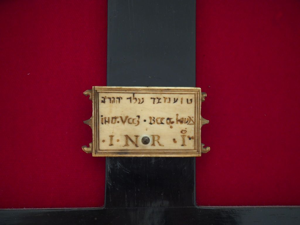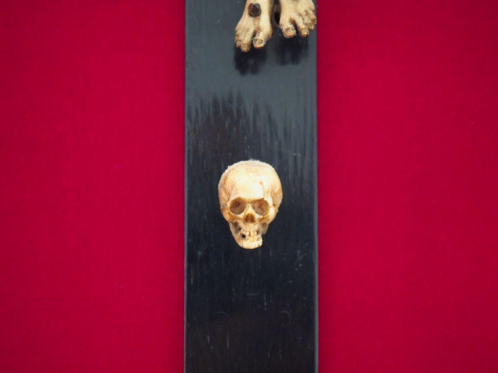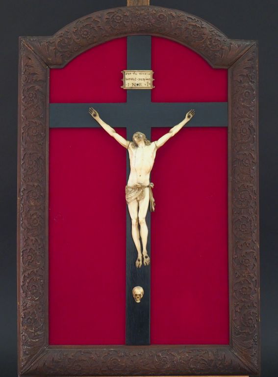 Crucifix XVIIème en ivoire dans un cadre en bois de Sainte Lucie par Bagard à décor de rinceaux feuillagés et d'un griffon. Dim. 55 x 36 cm Certificat CITES