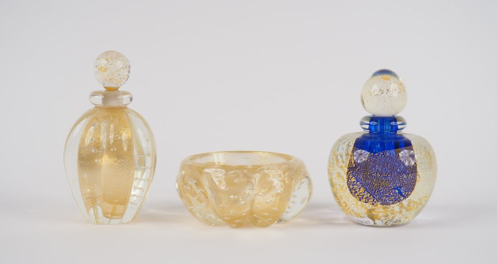 Lot de Deux différents flacons et un cendrier en verre pailleté d'or. au prix de 50 à 80 € en vente aux enchères par l'hôtel des ventes Primardeco