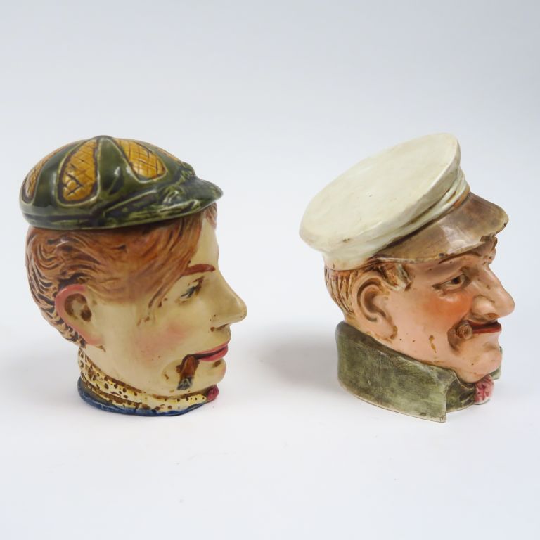 Deux différents pots à tabac 1900 en céramique polychrome "Homme à la casquette" et "Dandy anglais". H. 14,5 cm et 15 cm