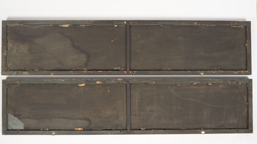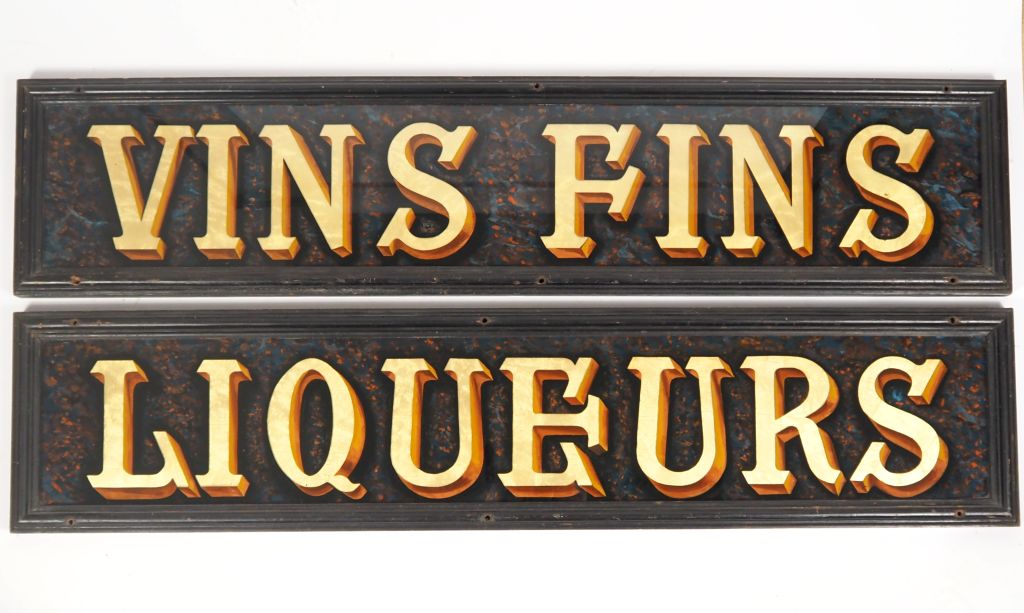 Deux enseignes polychromes et dorées, "vins fins" et "liqueurs", dans des encadrements en bois. Dim. 126,5 x 28 cm.