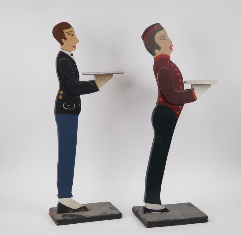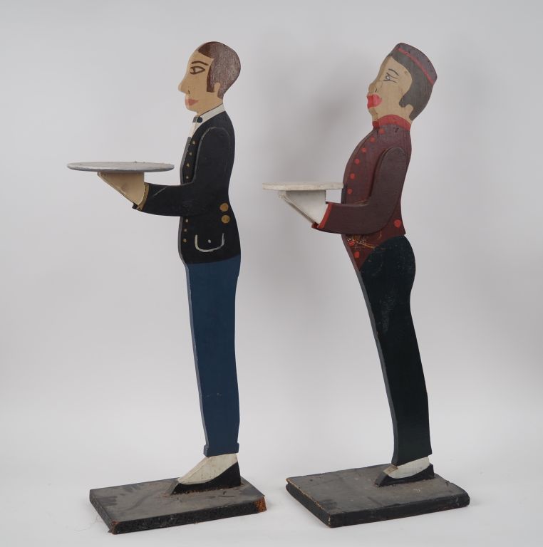 Deux serviteurs muets en bois sculpté polychrome représentant des majordomes. H. 88 cm. (usures).