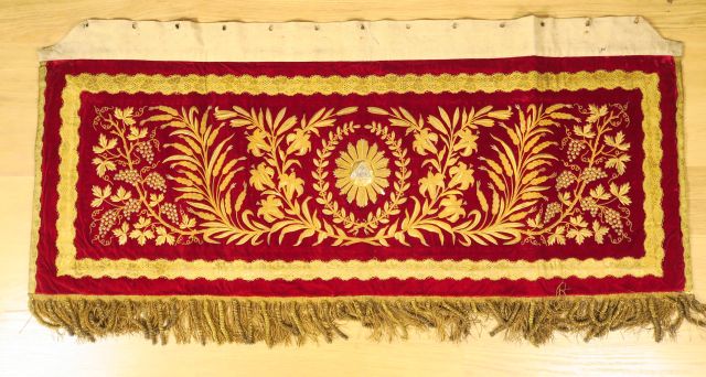 Devant d’autel ou antependium 56cm/150cm, XIXème siècle. Velours de soie rouge cramoisi, bordure et contre bordure de galons dorés encadrant un décor brodé aux lys -symbole de pureté- aux épis de blé, aux ceps de vignes et grappes de raisins - symboles de l’Eucharistie-. Au milieu dans une couronne laurée prend place un soleil radiant qui porte en son centre une plaque d’argent sur laquelle est brodée en frisures le nom de Dieu en hébreu. Filé or, lamé or, paillettes et frisures or. Frange en filé or, et frisures. Bande en lin de 9 cm de hauteur avec œillets permettant l’accrochage Très belle pièce Très bel état Expert : Véronique Dumont Castagné