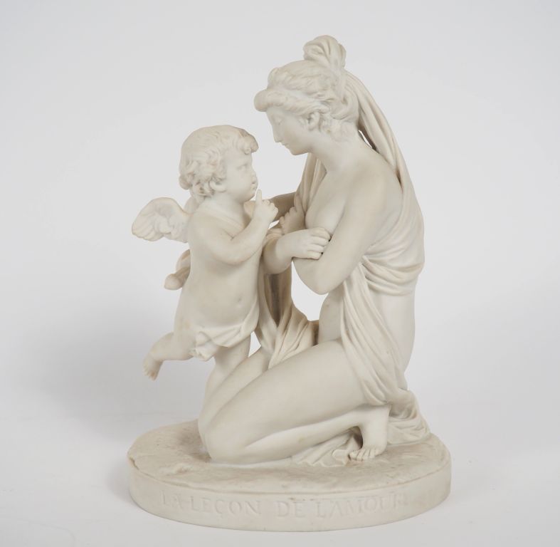 Ecole française. "la leçon de l'amour" Sujet en biscuit, titré sur la terrasse H. 21,5 cm
