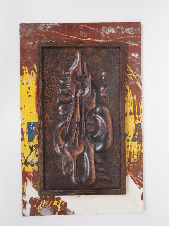 Ecole française XXème. "Composition". Plaque en cuivre à motifs cubistes en relief. Dim. 46 x 25 cm.