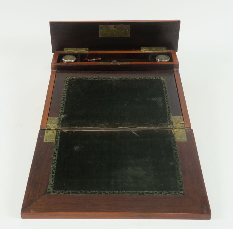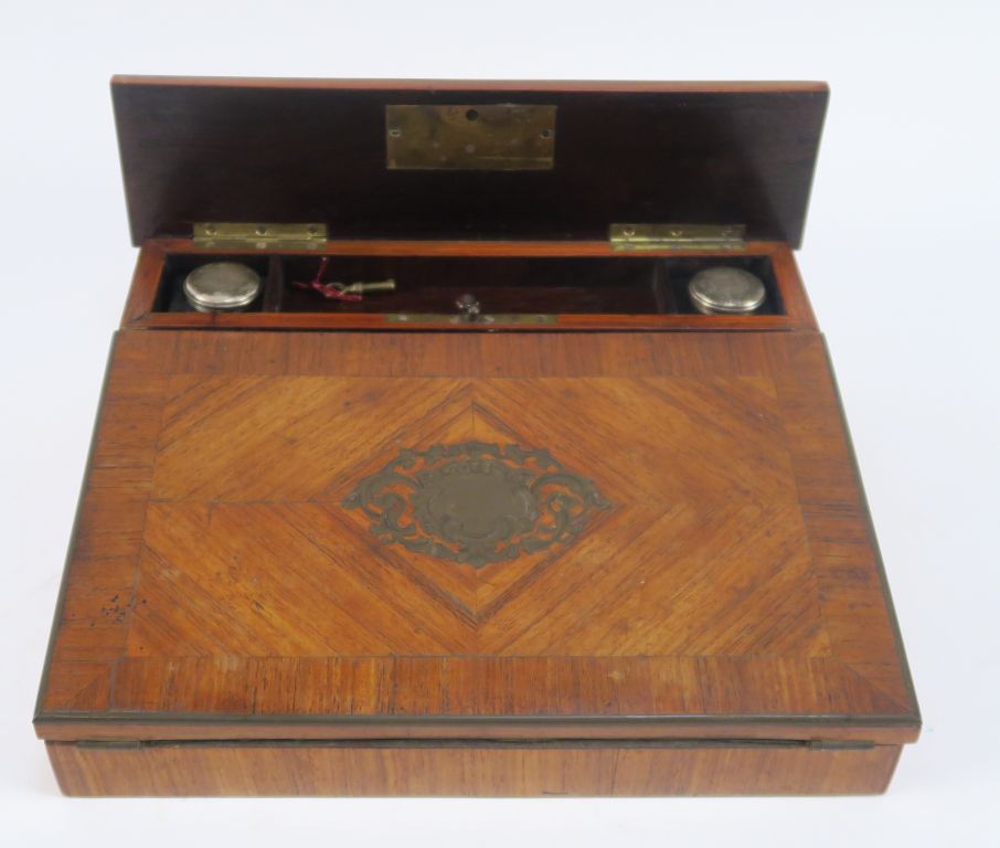 Ecritoire XIXème en marqueterie, fileté de laiton. 8 x 29 x 24 cm (petit accident à l'un des encriers)