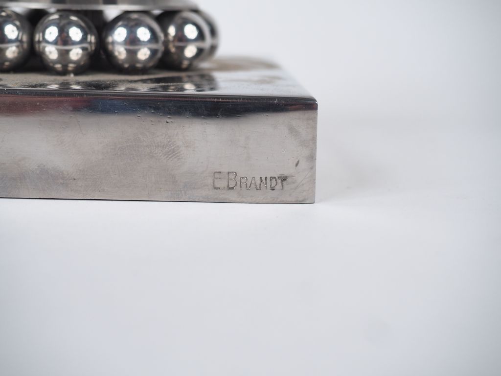 Edgar BRANDT. Base de vase Art Déco en métal chromé à décor de motifs géométriques. Signé. Dim. 8 x 10,5 x 10,5 cm.