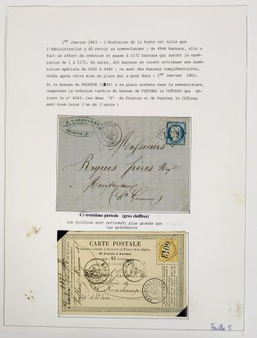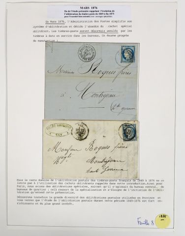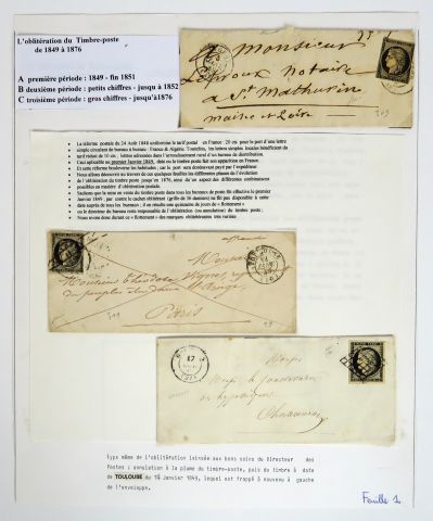 Ensemble de 8 plis datés de 1849 à 1876 relatant les débuts de l'oblitération du timbre poste , on y joint un exemplaire du bulletin des lois de 1887 concernant la création du bureau de poste de Toulouse , 2 plis 'acheminés Venise Toulouse via Marseille