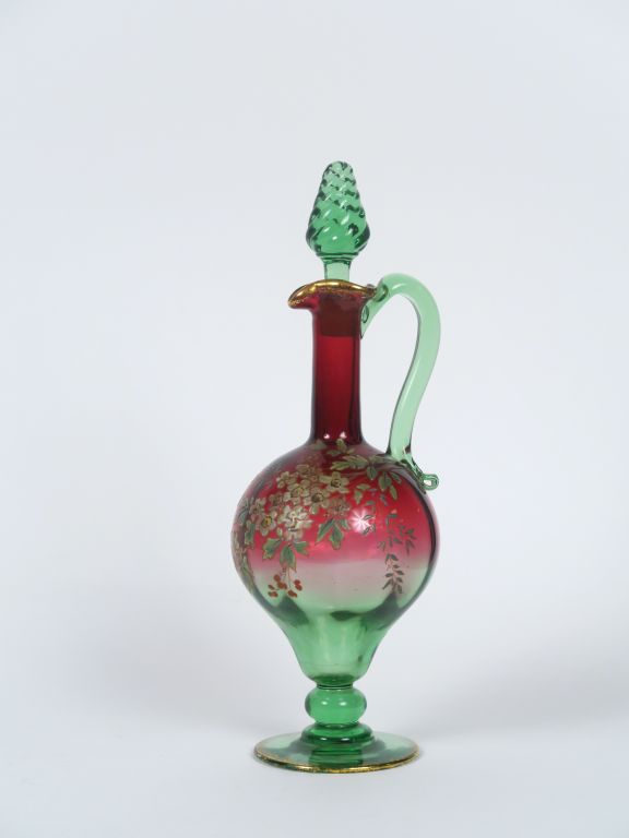 Flacon 1900 en cristal bicolore rouge et vert à décor de fleurs émaillées H. 34 cm