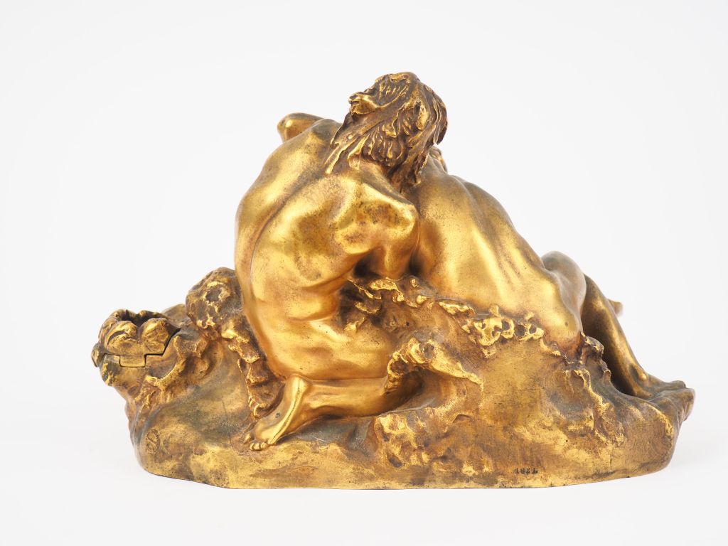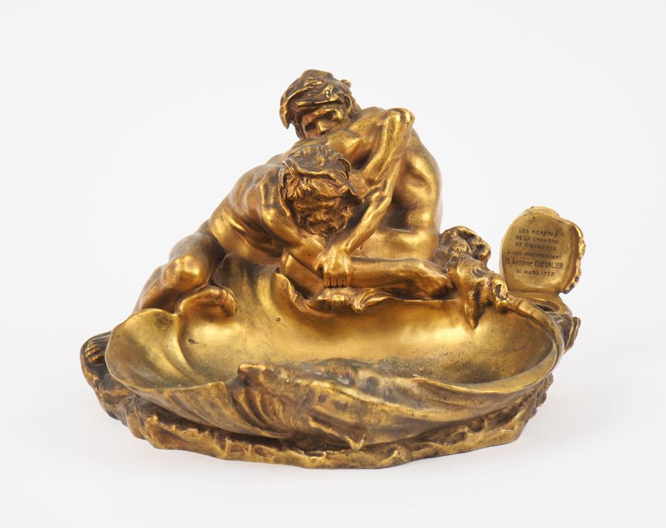 G. MICHEL. Encrier en bronze doré en forme de coquillage, à décor de dieux antiques. Dim.17 x 28 x 23 cm