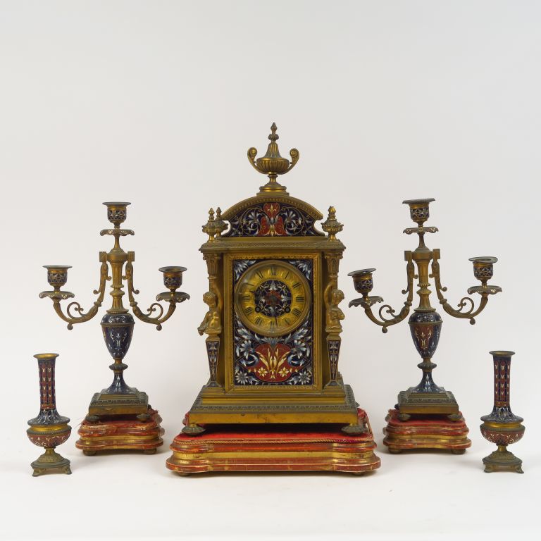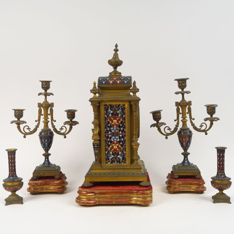 Garniture Napoléon III en bronze et émaux polychromes. Comprenant : - une pendule H. 38 cm - une paire de candélabres, éclairant à trois lumières H. 30 cm (un candélabre légèrement tordu) - une paire de vases H. 15 cm