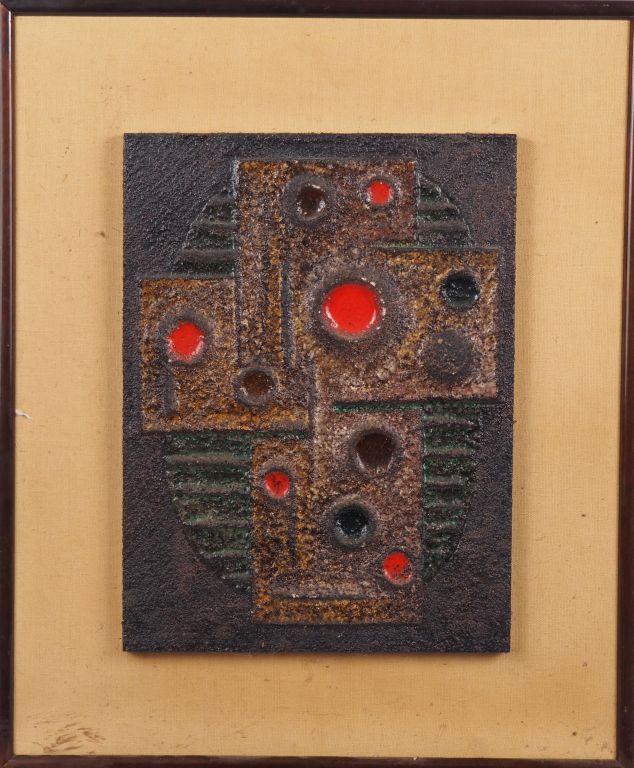 Gilbert PORTANIER. Plaque en terre émaillée polychrome à décor de motifs abstraits. Signée Dim. 30 x 40 cm