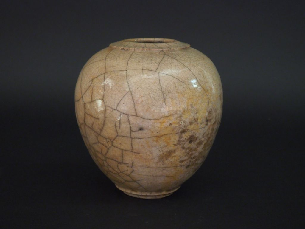 Gisèle BUTHOD-GARÇON. Vase en grés raku émaillé et craquelé beige. Signé du monogramme de l'artiste. H. 19 cm