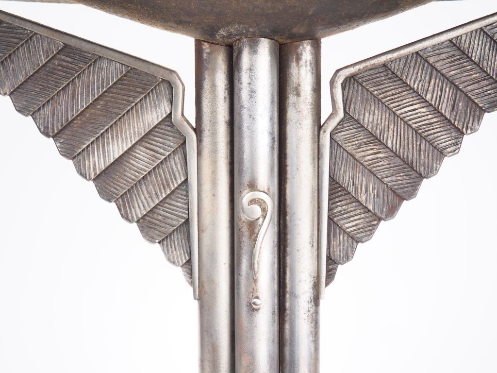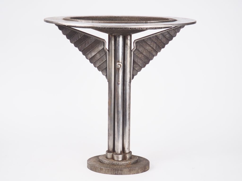 Grand trophée d'aviation de style Art Déco en bronze argenté et martelé décoré d'un point d'interrogation faisant référence au nom de l'avion des deux pilotes français COSTES ET BELLONTE. ayant réalisé la première liaison aérienne Paris New-York en 1930. H. 47 cm.