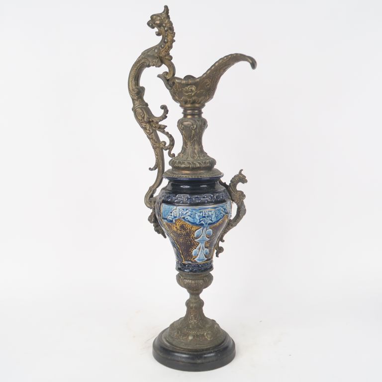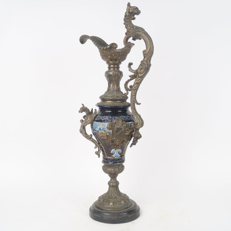 Grande aiguière Napoléon III de style baroque en céramique polychrome et régule à décor de rinceaux feuillagés, la prise formée par une tête de dragon. H. 72 cm.