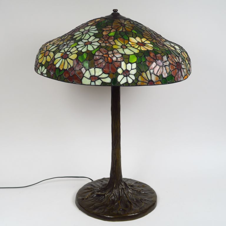 Grande lampe de style 1900 en bronze et verre multicolore. H. 78 cm