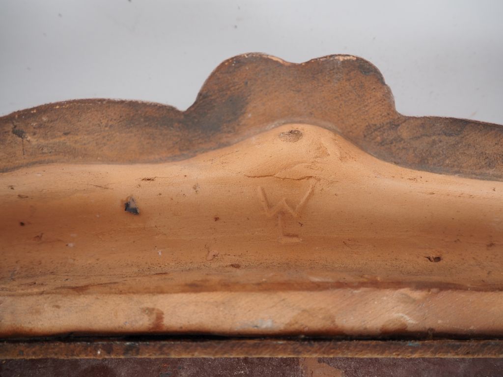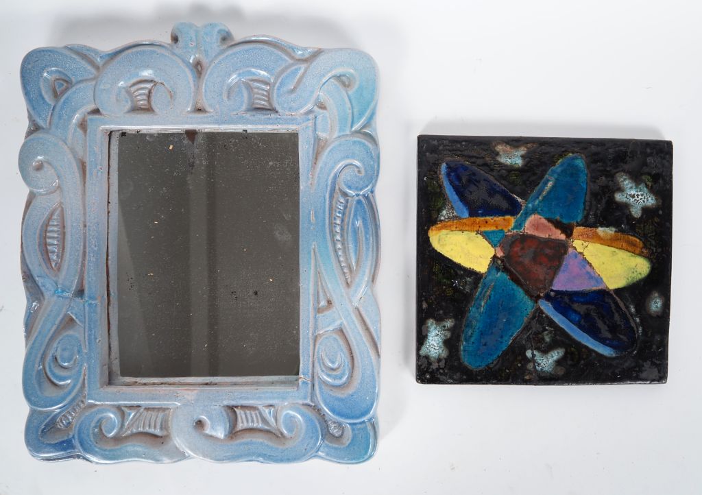 Henri Paul REY. Cadre en terre cuite émaillée bleu ciel, monogrammé WL et un carreau en terre cuite émaillée polychrome à décor d'étoile. Dim miroir : 37 x 30 cm Dim carreau : 21,5 x 21 cm