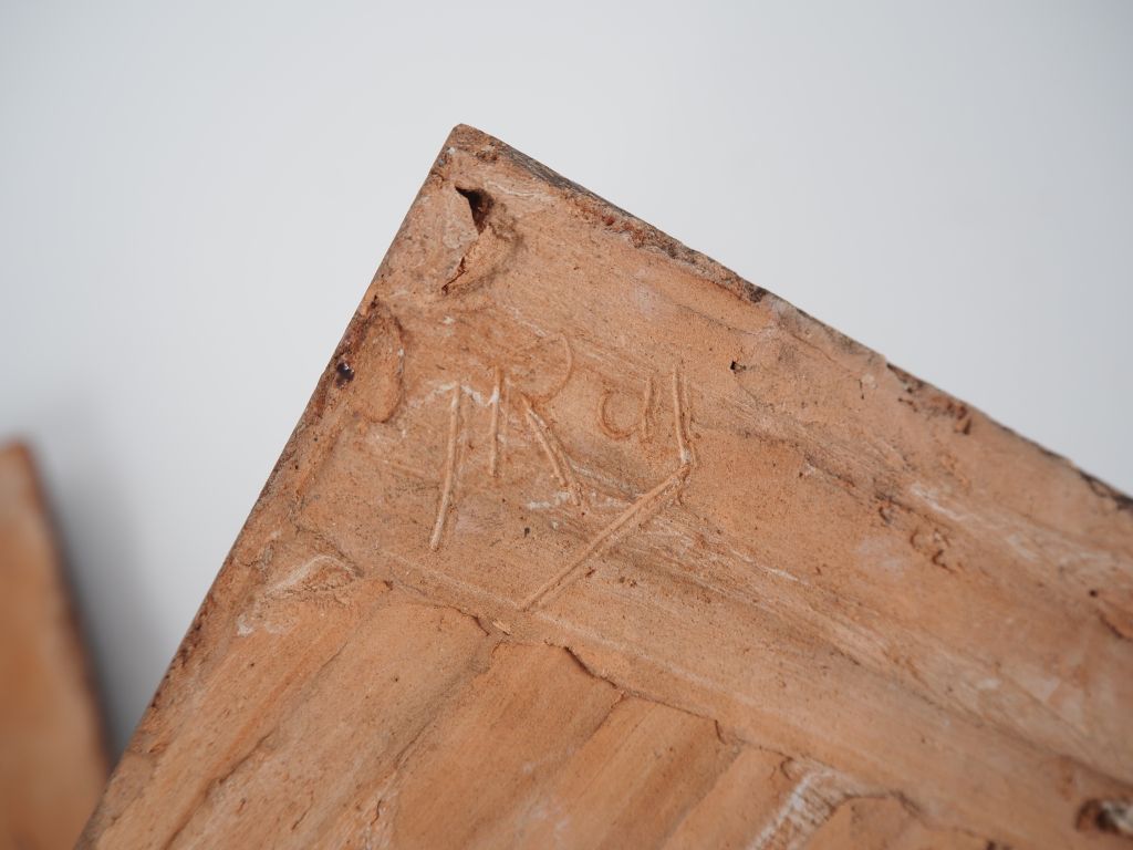 Henri Paul REY. "Violoniste et harpiste" Paire de plaques en terre cuite émaillée brune et cuivré Signées Dim. 18,5 x 18 cm