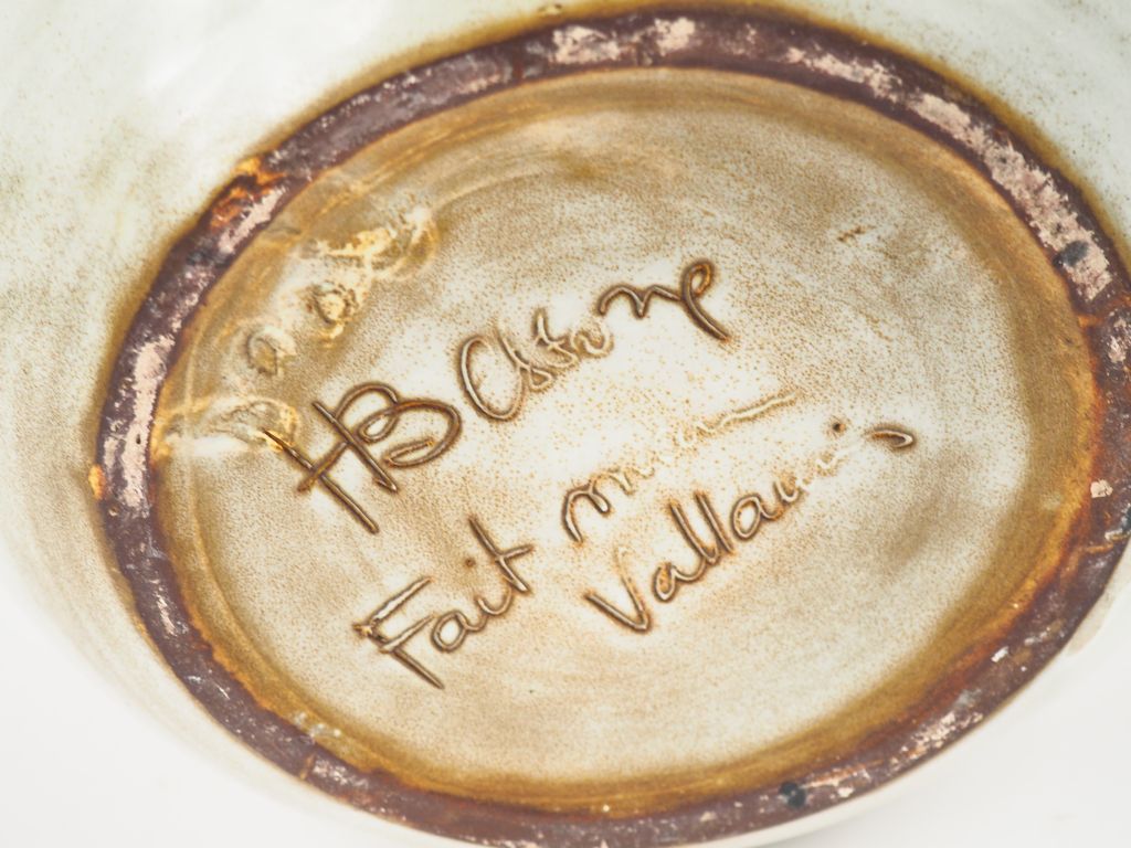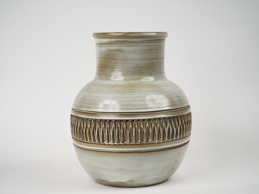 Huguette BESSONE. Vase ovoide en céramique blanche et brune de Vallauris. Signé. H. 36 cm (égrenure au col)