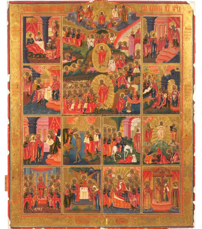Icône de la Résurrection et des douze fêtes principales de l'Orthodoxie. Seconde moitié du XIXe siècle. L'icône de la Descente aux enfers et de la Résurrection occupe la partie centrale de la moitié supérieure, avec de part et d'autre quatre vignettes représentant : la Nativité de la Marie, la Présentation au Temple de Marie, l'Annonciation, la Nativité de Jésus. La moitié inférieure comprend deux rangés de quatre vignettes chacune représentant : la Présentation au Temple de Jésus, le Baptême du Christ, l'Entrée à Jérusalem, la Transfiguration, la Pentecôte, la Trinité d'Abraham, la Dormition de la Vierge et l'Élévation de la Croix. Tempera sur bois à fond or. Dim. 44 x 34 cm Expert : Nicolas FILATOFF