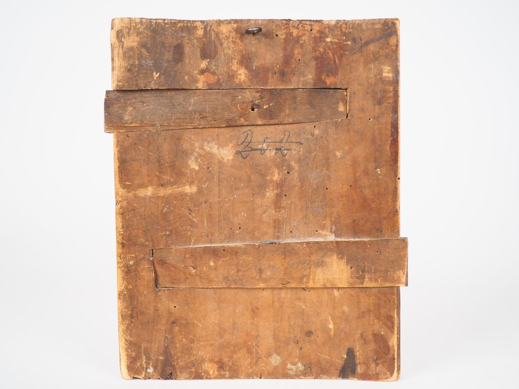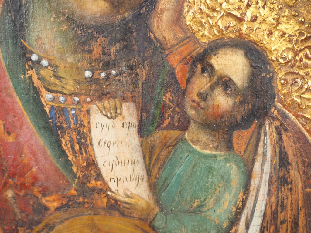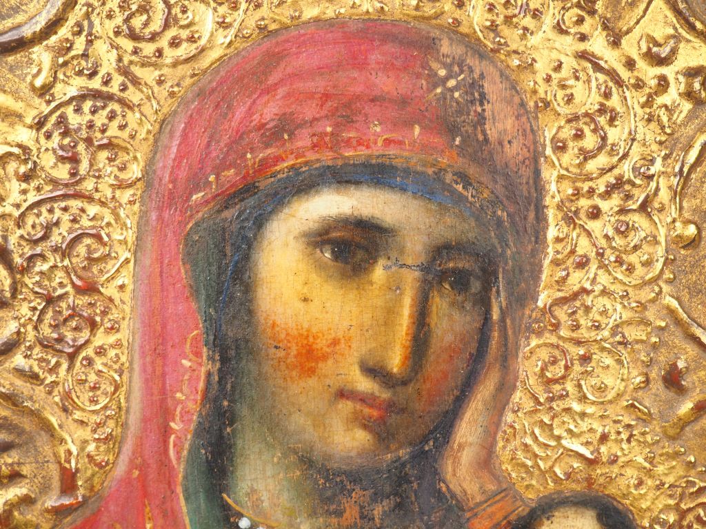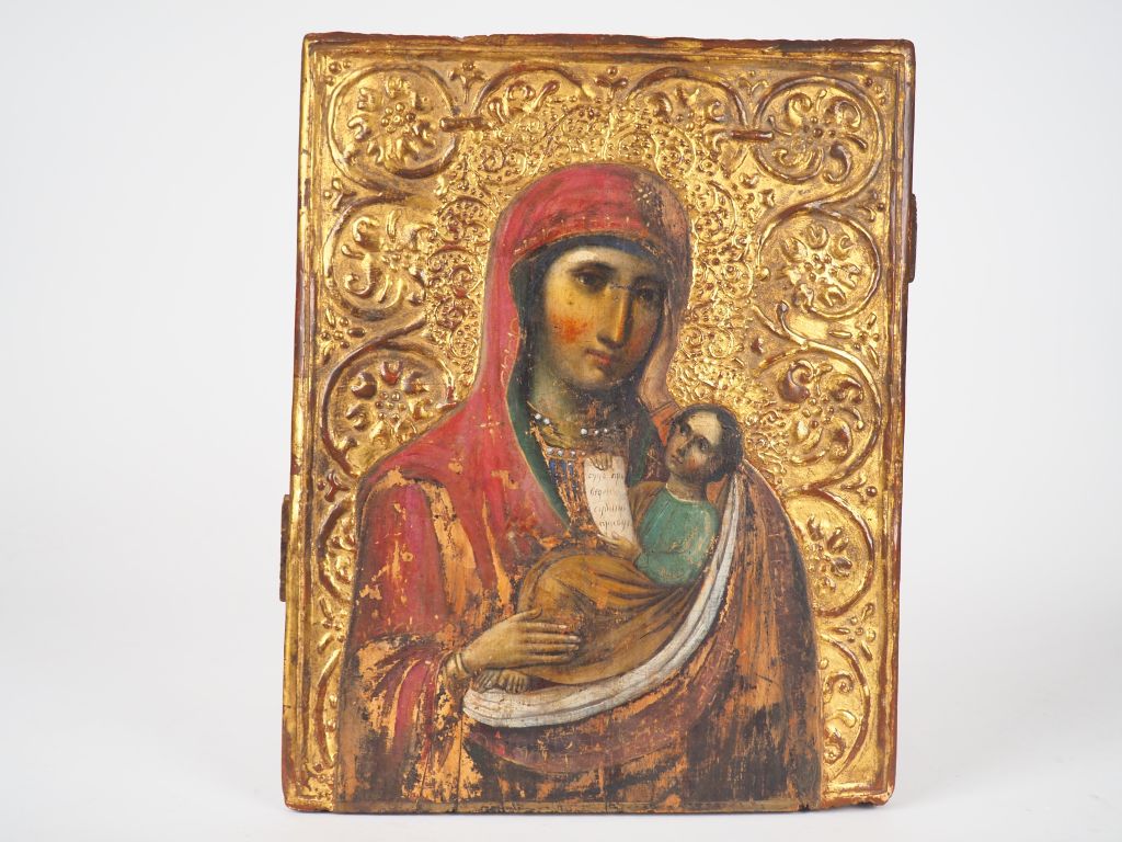 Icône de la Vierge "Apaise mes chagrins". Fin du XIXe siècle. Peinture sur bois. La bordure est ornée de rinceaux à deux motifs, les nimbes de rinceaux beaucoup plus fins. Ces décors sont en stuc (levkas) doré en relief, technique apparue en Ukraine au XVIe siècle et en Russie à la seconde moitié du XVIIe siècle. Le nom de l'icône est inscrit à la mine de plomb au dos sur le raidisseur inférieur. 30,5 x 24,3 cm État : manques et accidents, repeints. Expert : Monsieur Nicolas Filatoff.