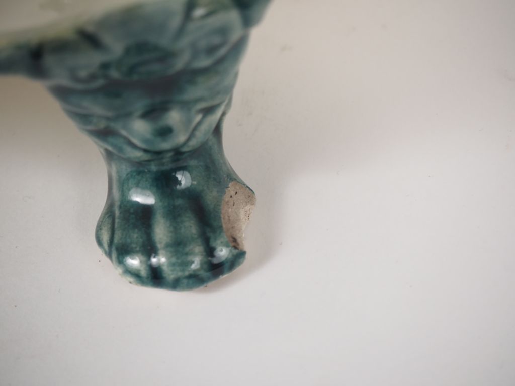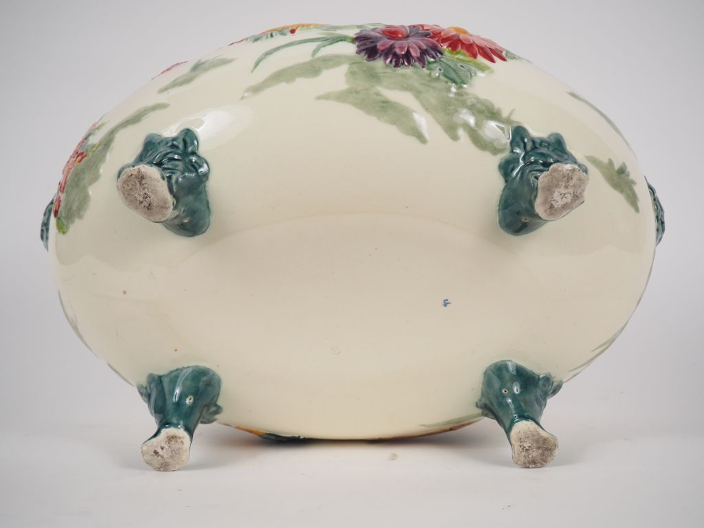 Jardinière 1900 en barbotine à décor de fleurs polychromes sur fond clair, de coqs et de mufles de lion , pieds griffe. Dim. 20 x 44 cm (fel, égrenure)