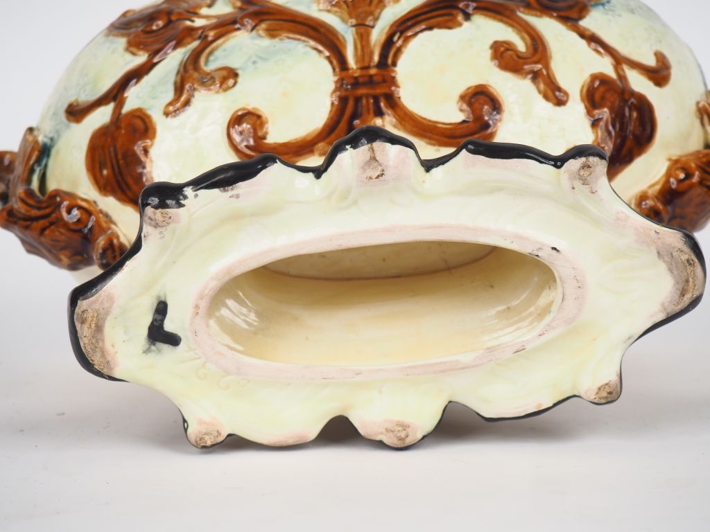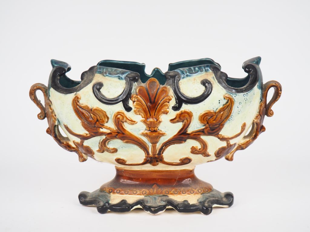Jardinière fin XIXème en barbotine polychrome à décor de rinceaux feuillagés. Dim. 23 x 40 x 20 cm.
