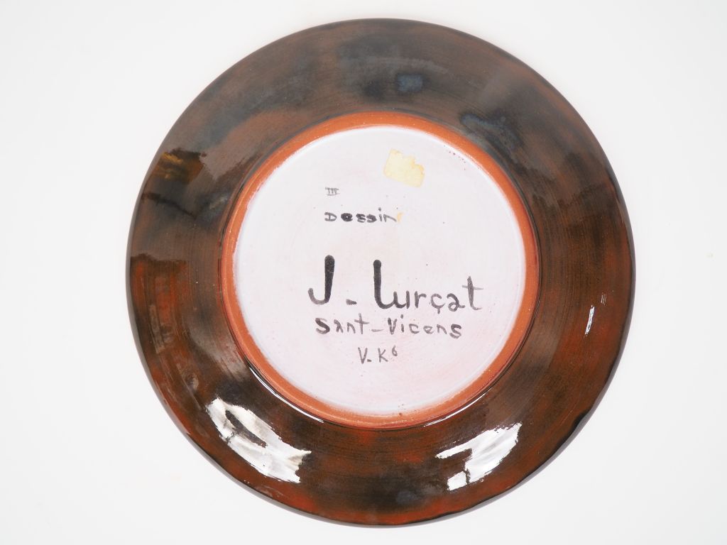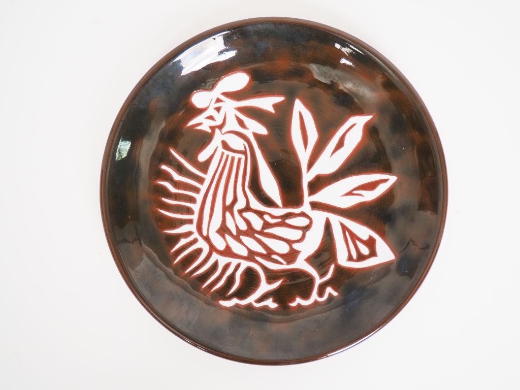 Jean LURÇAT pour Sant Vicens. Assiette en céramique brune et blanche "le coq" Signée Diam. 21 cm