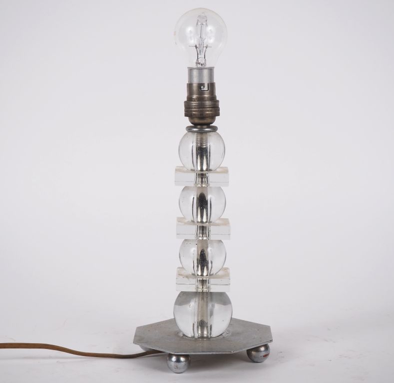 Lampe de style Art Déco en verre et métal argenté reposant sur quatre pieds boules. H. 21 cm,