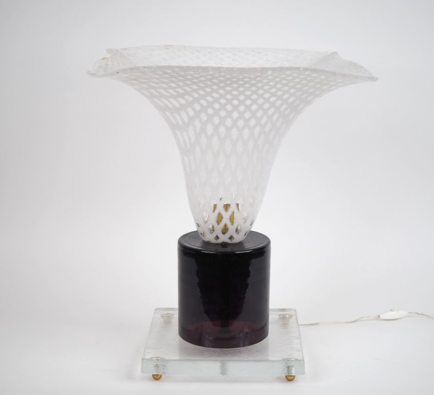 Lampe design en verre noir résillé blanc et translucide, pieds cylindrique sur un socle carré, abat jour cornet. H. 57 cm
