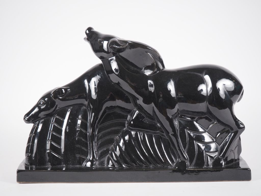LEMANCEAU. Groupe Art Déco en céramique noire "les biches" Signé Dim. 29 x 45 cm (petite égrenure à un angle)