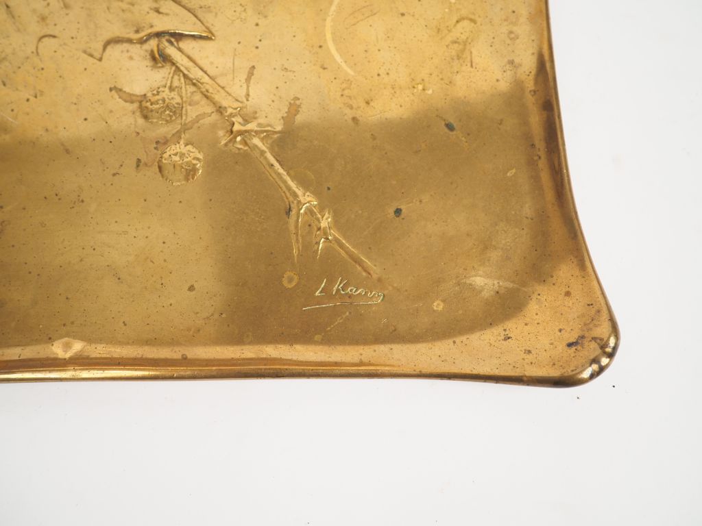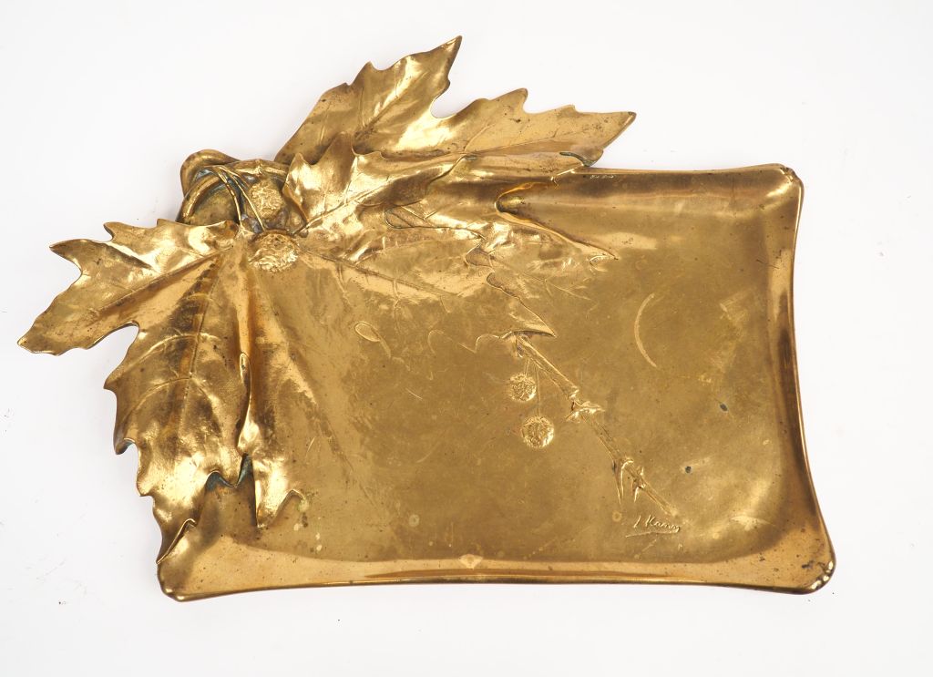 Léon KANN. Plateau Art Nouveau en bronze à décor en relief de chataignier. Signé. Dim. 33,5 x 44,5 cm.